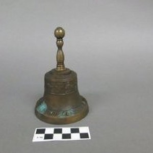 Bell, model. Brass. Decorative handle at top, bell has floral design at top and lettering along the flange. Some minor oxidation has caused parts of the bell to turn green.