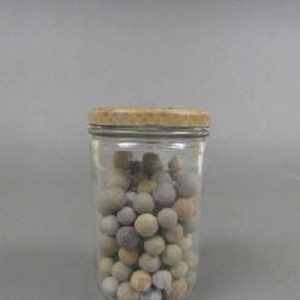 Glass jar containing stone marbles.