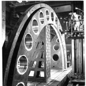A machine tool in the York, Pa., plant of Allis Chalmers perforates a section of a pump turbine bound for the Oroville Dam, under construction.