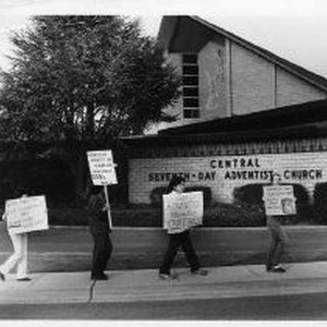 Animal rights supporters protest the "Baby Fae" baboon heart transplant in front of the Central Seventh-Day Adventist Church in Sacramento.