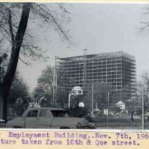 Typed on binder page "New Employoment Building..Nov. 7th, 1962. Picture taken from 10th & Que (sic) street." View of building under construction from across the street seen through a playground.