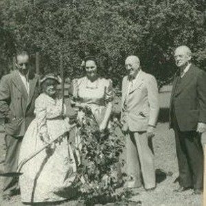 Group photograph outside Sutter's Fort planting trees. Mary E. Bell seen with shovel. Others include Bart Cavanaugh, Genevieve Didion, Percy West , and Joseph R. Knowland.