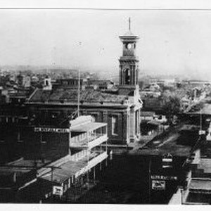 Copy Print: Street scenes of businesses on K Street from 7th Street looking east in 1869. The Golden Eagle Hotel is on the left and St. Rose of Lima Church is across 7th Street further on the left.
