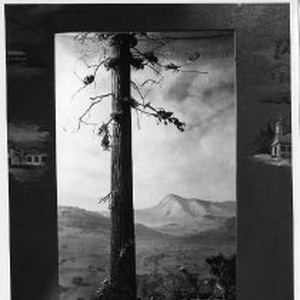 Closeup view of California State Fair exhibit containing a small-scale model of a California Giant Sequoia tree and deer with valley and rolling hills set in background. Caption beneath model reads "A history under seven flags and lives of great men lend a colorful background to our beautiful country."