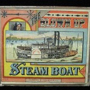 Puzzle, "Blown Up Steamboat" Jigsaw, "The Blown Up Steamboat" by Peter G. Thompson, Cincinnati, O. Box: cardboard, 16.5 cm x 13 cm x 2.8 cm., graphic image of a paddlewheel steamboat "Queen City", upper left corner head of a man wearing a hat. inside box: graphic image of a paddlewheel steamboat "Queen City", 41 cm x 35 cm (unfolded) Pieces: 30 pieces, when put together form the picture of the steamboat on the box lid.