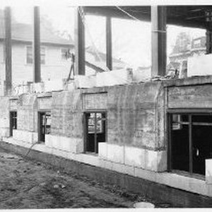 Exterior view of the construction site for the new Sacramento Post Office and Federal Courthouse at 805 I Street between 8th and 9th Streets. This is a view showing the basement granite and steel windows on the 8th Street side.