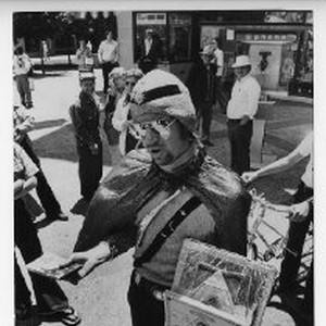 Barry McArdle, street performer, in a costume with turban and cape, selling real estate on the moon