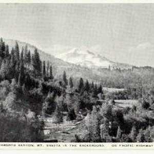 Postcard, Sacramento Canyon, Mt Shasta in the background, On Pacific Highway.