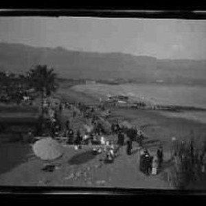 Long view of a public beach with crowds of people identified as being in Santa Barbara.