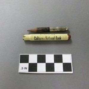 A black painted wood pencil with a metal cap which fits into an off-white painted metal holder with eraser. Printed on the holder in black "Compliments California National Bank Sacramento, Calif." Pencil has been used until there is only a short stub remaining.