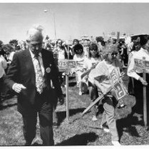 Television personality Bob Barker leads a group of Measure L supporters off to leaflet voters. The crowd gathered at the Sacramento County Animal Control. The measure would prohibit the sale of animals from the Sacramento County pound to the University of California, Davis, and other educational institutions and hospitals for use in medical experiments and veterinary school teaching.