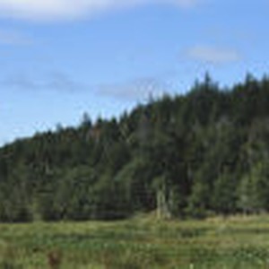 Many dead Port Orford cedars at the edge of a meadow.
