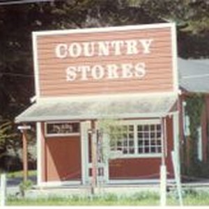 Photo--color: Duncans Mills circa 1983. Building with large sign "Country Stores." 'Pig Alley' store sign in window.
