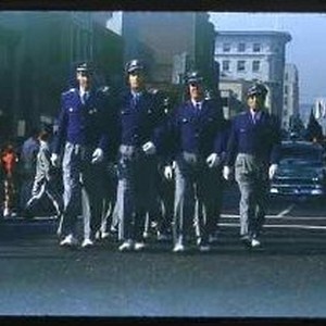 Views of Armistice Day parade on J Street at Plaza Park. This view shows an unidentified marching group of men in blue and gray uniforms. .The slide is dated November 11, 1952.