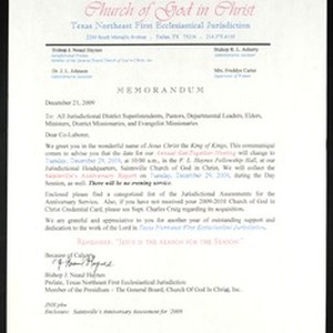J. Neaul Haynes (Church of God in Christ), Dallas, Texas, memo, 2009 December 21, to "all jurisdictional district superintendents, pastors, departmental leaders, elders, ministers, district missionaries, and evangelist missionaries" (Church of God in Christ). [Description English/roman)]