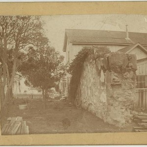 Back of the photo labeled "Mission Wall". Photo appears to be taken from the northeast wall of the Carnegie Library, unless the photo predates it.