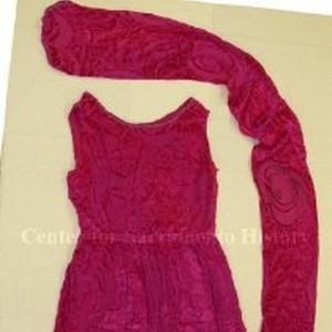 Dress with sash - Fuchsia silk with scalloped hem along bottom and beaded fringe along scallop, neckline, and sash ends.