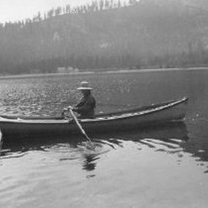 Woman wearing wide-brimmed hat paddles a rowboat on a quiet lake.
