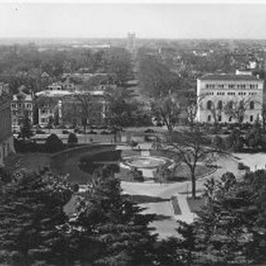 View of downtown Sacramento taken from the Capitol dome, looking southwest down Capitol Avenue towards the Tower Bridge. The State Library and Courts Building and Treasurer's Building visible in foreground.