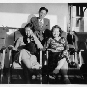 Y. C. Hong is standing behind two deck chairs occupied by Mabel Hong and an unidentified woman. Hong family papers. The Huntington Library, San Marino, CA.