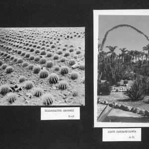 Two photographs of the desert garden mounted on a black page, labeled "Echinocactus grusonii, C-45" and "Agave carchariodonta, A-51."