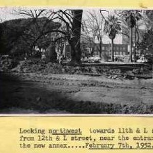 Typed on binder page "Looking northwest towards 11th & L street from 12th & L street, near the entrance of the new annex.... [to the Capitol ]. February 7th, 19152" The view is of a portion of the Capitol Park with bare dirt in the foreground.