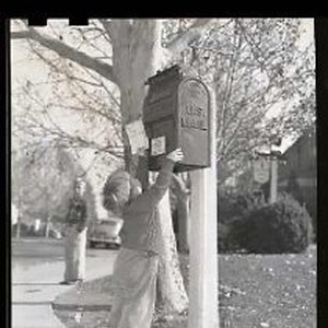 1950 Associated Press contest winner: "When a fellow needs a friend" shows Little boy reaching for mail box to mail a letter.