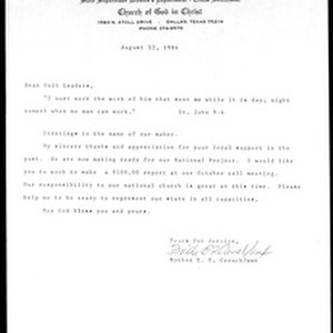 Emma F. Crouch (Church of God in Christ), 1593 Atoll Drive, Dallas, Texas, letter, 1984 August 12, to Church of God in Christ "unit leaders". [Description English/roman)]