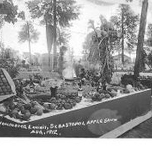 Postcard--black and white: A 1912 Gravenstein Apple Show exhibit by the town of Healdsburg shows a table with apples and fruit.