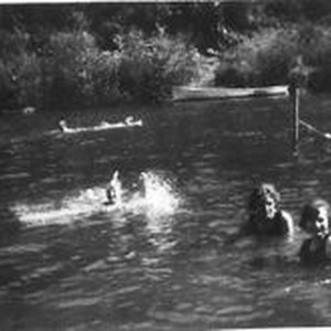 Photo--black and white: Bunni Myers, 1906-2001, (in right foreground) and unidentified friend at Guernewood Park, Russian River, June 1921. A canoe is seen in background. Bunni was a longtime resident of Sebastopol and was married to Sebastopol Mayor George Streckfus.