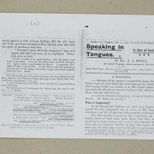 Tract [4 pages] defending glossolalia entitled "Speaking in tongues: is this of God?" by Rev. Alexander A. Boddy. [Description English/roman)]
