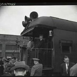 Truman's campaign train in station. Part of crowd mills around as Truman stands by as Gov. Knight speaks.