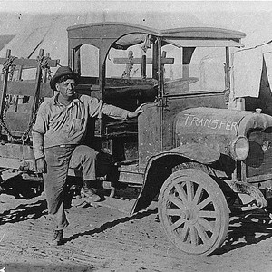 This is an early type of transfer truck used in the Porterville, CA, area about 1915. This driver is not known but some of the transfer people were Jim Niles, a Mr. Moore, and the Howell men. (Photo courtesy of Porterville Library)