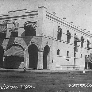 The First National Bank in Porterville, CA, was founded about 1900. Located on the northeast corner of Main and Mill streets, the building was one of the early ones with amore permanent type of brick construction. The wooden buildings on the east side of Main Street between Putnam and Mill streets were moved in from the town of Plano in the 1870s and were still in use when the railroad came in 1888. (Photo courtesy of Porterville Library)