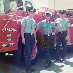 Color photograph of 3 firemen in front of Alta Loma Fire Department firetruck (1960 Ford Tilt Cab - gas powered) front - Bill Bryan, middle - Joe Longo, back - Dave Fritchey. If you know any details from this image please contact the Rancho Cucamonga Public Library at (909) 477-2720 or reference@cityofrc.us