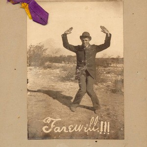 Black & white photograph of a man wearing a suit and bowler hat with arms up and knees bent. Purple and gold ribbons tied to the top left corner of the photograph. Writing at the bottom in white cursive , "Farewell!!!" The back of the photograph is covered with names written in pencil. Legible names include: Gertrude Reid, Edward B. Lester, Annie Maxson, Mary G. Cogswell, Harry Celay, Florence Baldwin, Alice M. Baker. If you know any details from this image please contact the Rancho Cucamonga Public Library at (909) 477-2720 or reference@cityofrc.us
