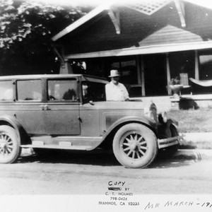 This photo shows W. B. Mr. March standing next to a car in front of his house in Ivanhoe, CA. Although the date written on the photo is 1915, the auto appears to be more of a late 1920s model.