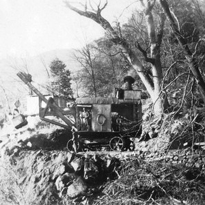 "Jim Hensley drives a steam shovel during road construction of California Highway 198 to Sequoia National Park. The road is referred to as ""the General's Highway,"" leading to the General Sherman redwood tree. (Photo courtesy of Debra Harrell)"