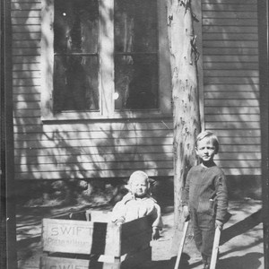 Photograph of a girl and a boy in front of a house. The girl is seated in a box and the boy is holding sticks. If you know any details from this image please contact the Rancho Cucamonga Public Library at (909) 477-2720 or reference@cityofrc.us