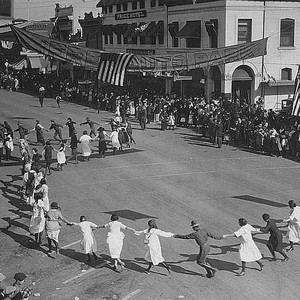 In 1922 during the Armistice Day Parade, school children campaigned for the construction of a new high school to be built on West Olive Street. This is a view of the school children in the parade. The school was built that same year and the first class attended in 1923. (Photo courtesy of Porterville Library)