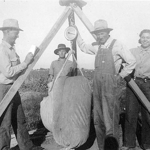 Royce McGregor, left. weighs cotton picked by one of the workers on the ranch he leased in 1941 in Pixley, CA. The three workers are unidentified. (Photo courtesy of Carolyn M. Long)