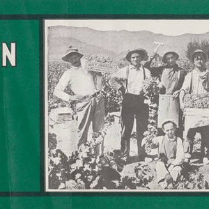 Green, white and black label with photograph of men in a field holding boxes of grapes. If you know any details from this image please contact the Rancho Cucamonga Public Library at (909) 477-2720 or reference@cityofrc.us