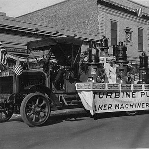 "As an attraction to the 1922 Armistice Day parade in Porterville, CA, drivers conducted a street race in from Oak Street to Morton Street and then to Second Street. The parade included such ""floats"" as this truck-borne turbine. (Photo courtesy of Porterville Library)"