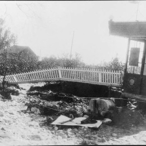 Photograph shows gas station building raised off its platform above a field of debris. There is a white picket fence along the left side of the station that appears to be damaged from the debris. If you know any details from this image please contact the Rancho Cucamonga Public Library at (909) 477-2720 or reference@cityofrc.us