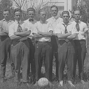 The boys' soccer team at Lindsay High School in Lindsay, CA, 1916-1917, was composed of Zeke Lapham, Paul Gifford, Ward Stennett, Aub. Stalling, F.H. Boren, Chas. Lehinan and Mayna Culham. (Photo courtesy of Alma Manlove)