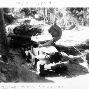 "A logging truck is loaded at Camp Conifer, the ""gateway"" to Mineral King Valley in Sequoia National Forest, California. Logging from this location took place from 1943 to 1954. (Photo courtesy of Linda Hengst)"