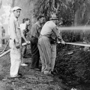 Black and white photograph of 7 people dousing eucalyptus fire. If you know any details from this image please contact the Rancho Cucamonga Public Library at (909) 477-2720 or reference@cityofrc.us