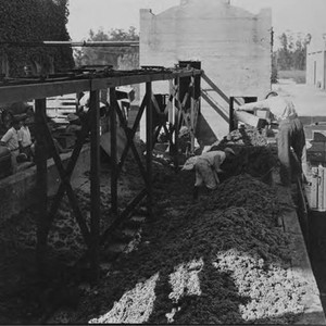 Photograph of men working grapes onto a conveyor belt at the Virginia Dare Winery. If you know any details from this image please contact the Rancho Cucamonga Public Library at (909) 477-2720 or reference@cityofrc.us
