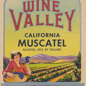 Full color label for Wine Valley California Muscatel. Label illustration depicts a field of grapes with a woman in a red dress with a basket of grapes in her hands in the foreground. Wine is selected and bottled by J. Filippi Vintage Corp. Mira Loma, California. If you know any details from this image please contact the Rancho Cucamonga Public Library at (909) 477-2720 or reference@cityofrc.us