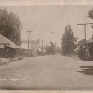 Postcard of Cucamonga, CA. The picture is taken about 1907. View is toward the south on Archibald Avenue. From a position just north of San Bernardino Road. If you know any details from this image please contact the Rancho Cucamonga Public Library at (909)